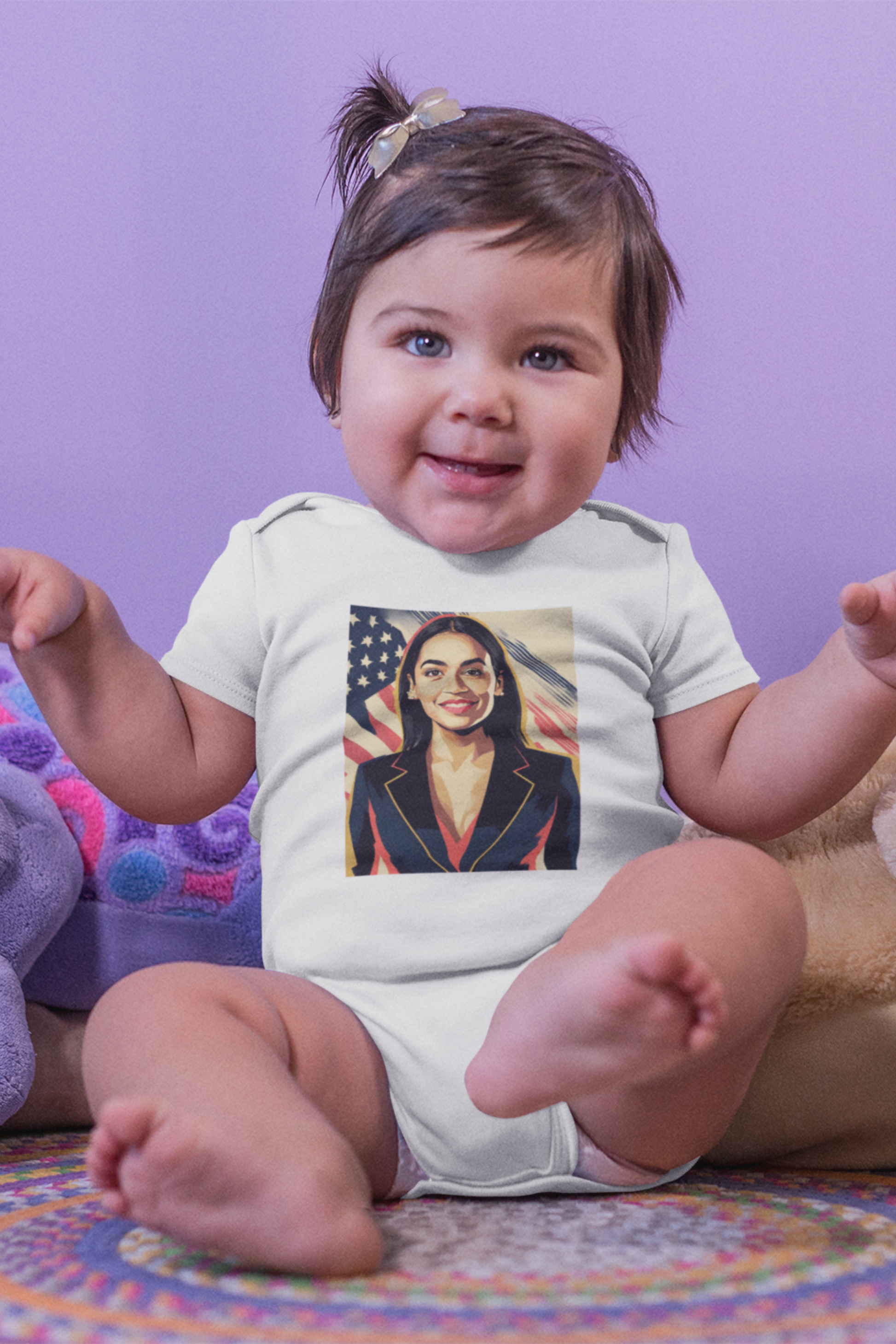 Celebrate the inspiring legacy of Alexandria Ocasio-Cortez (AOC) with this adorable AOC Newborn Onesie! Perfect for gifting at a Baby Shower, or as a special treat for your Baby Boy or Baby Girl. This unique design features a sublimation print of the dynamic AOC, making it not only a stylish piece of baby clothes but also a tribute to a young leader who is transforming the political landscape.