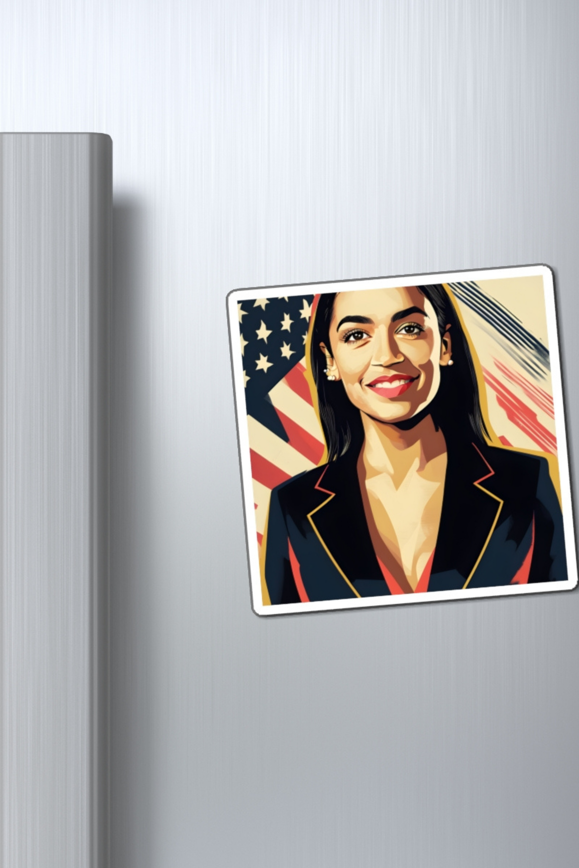 This Fridge Magnet brings bold, modern art into your home or office with a tribute to AOC's empowering presence. It's a fantastic way to showcase your USA pride while adding a dash of color and character to your fridge, locker, or workspace.