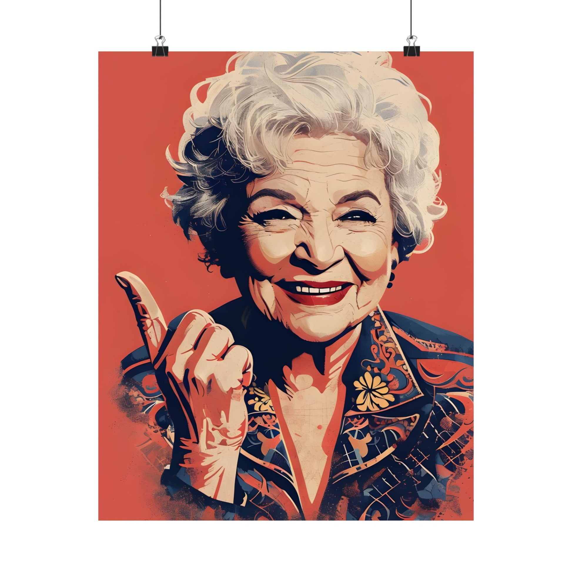 Introducing the ultimate way to bring art into your space; the premium matte vertical posters. This eye-catching Betty White digital art print is the perfect addition to your wall art collection. With its vibrant colors and intricate details, it will capture the attention of anyone who lays eyes on it. Printed with high-quality pigmented archival inks, each poster provides outstanding clarity and rich color fidelity, creating a lasting impact on your wall.