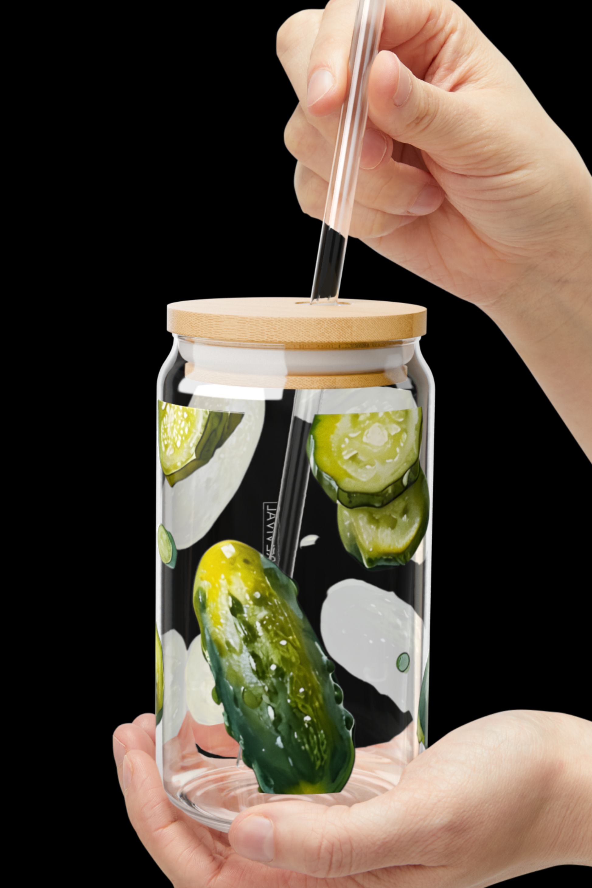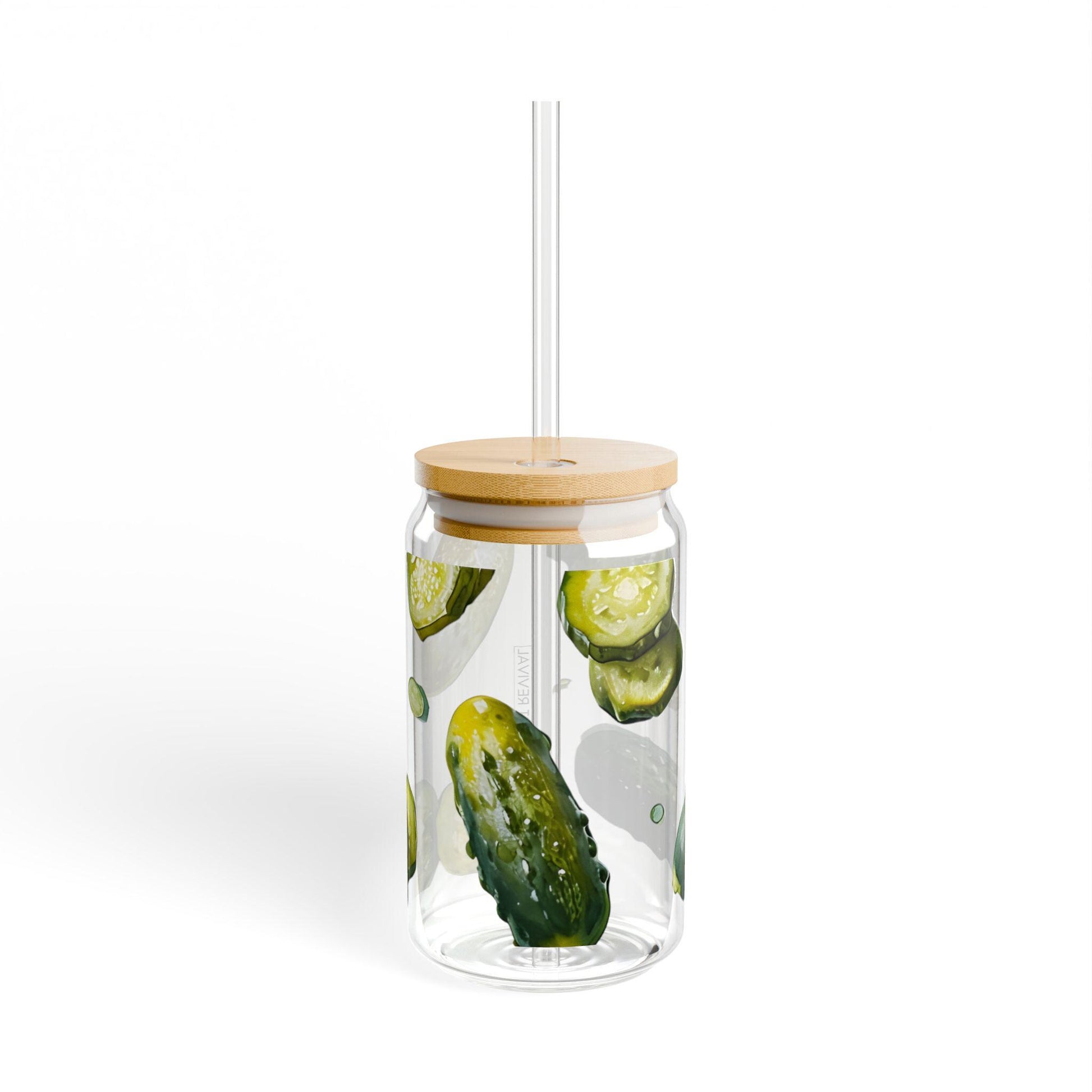 Sip with a twist of fun using this pickle-themed 16oz sipper glass! Featuring quirky, vibrant pickle prints on clear, durable tempered glass, this stylish cup is perfect for serving iced coffee, cocktails, fresh juices, or your beverage of choice.